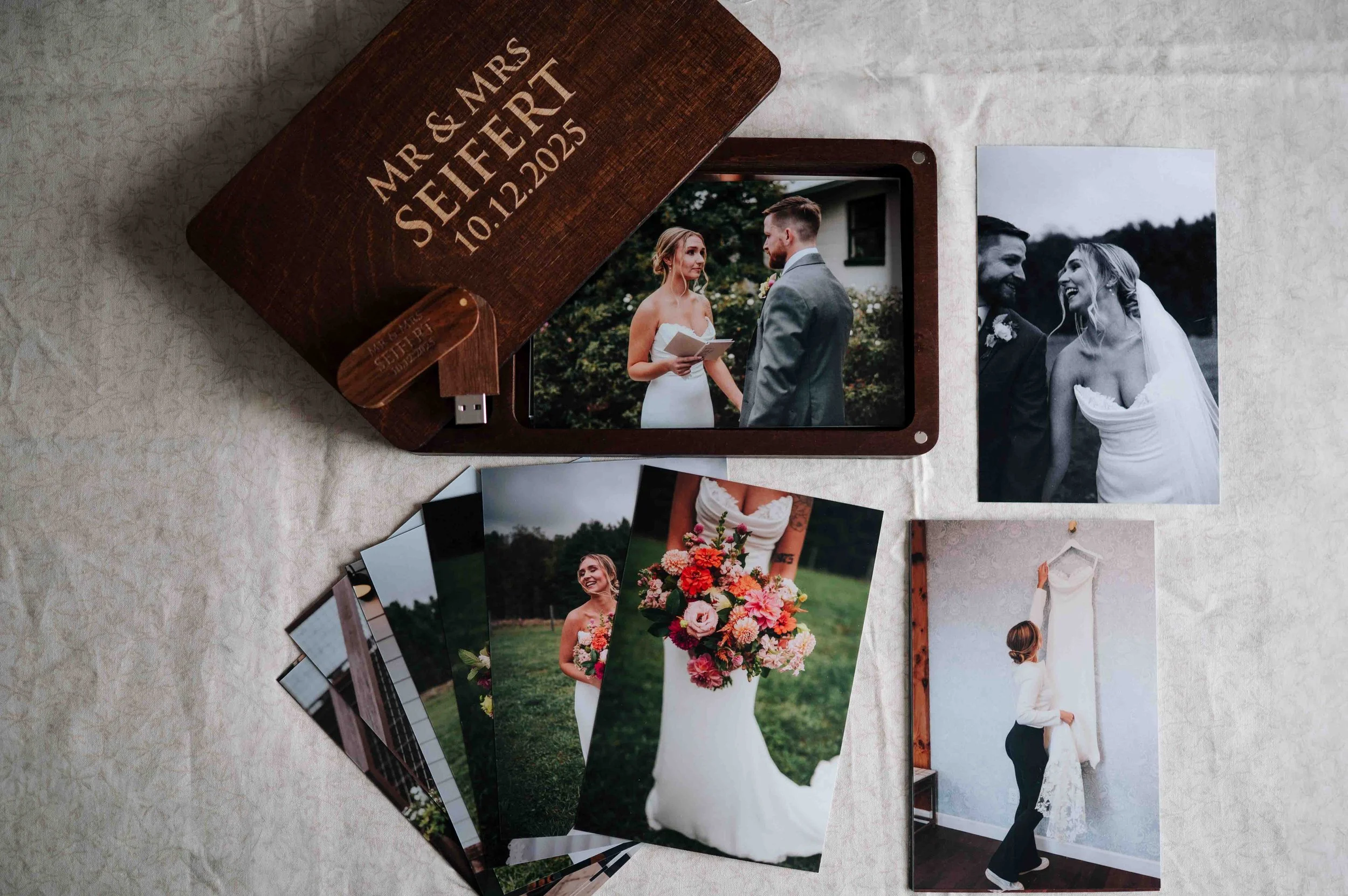 Every wedding package includes an engraved wooden USB delivered in a keepsake box with some printed 4×6 photos that I love. It's not an add-on, it's not an upsell — it's just part of what you get.